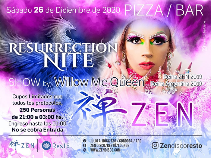 En su ‘Resurrection Nite’ tal cual es llamada este regreso a la noche cordobesa, Zen presentará el show de Willow McQueen, quién ostenta los títulos de Reina Drag Zen 2019 y Reina Drag Argentina 2019